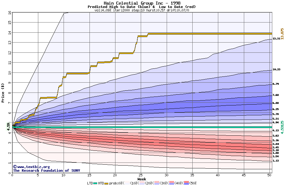 The high to date and low to date prices of the stock plotted against a random walk model for 1998 (what's this?).