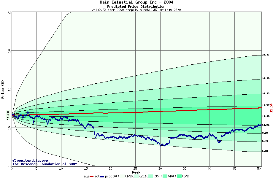 The following graph plots the year-to-date performance of the stock for 2004 compared to the probability calculated by a random walk model.
