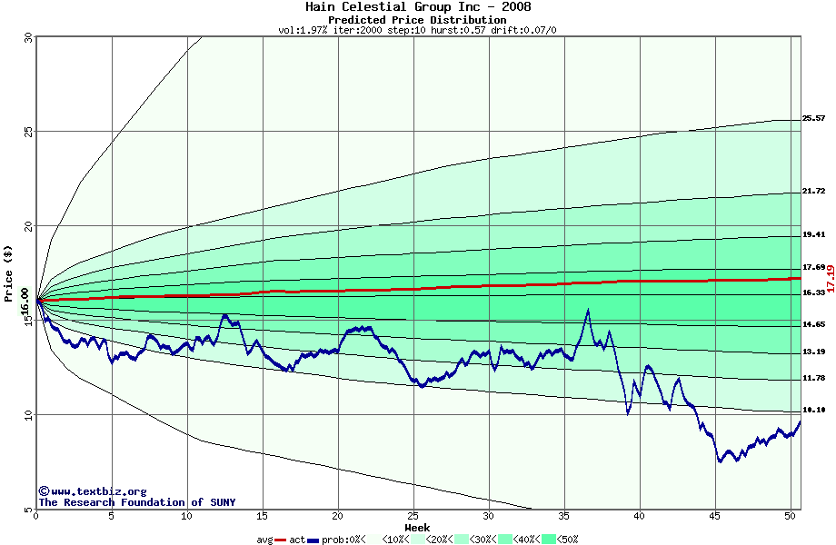 The following graph plots the year-to-date performance of the stock for 2008 compared to the probability calculated by a random walk model.