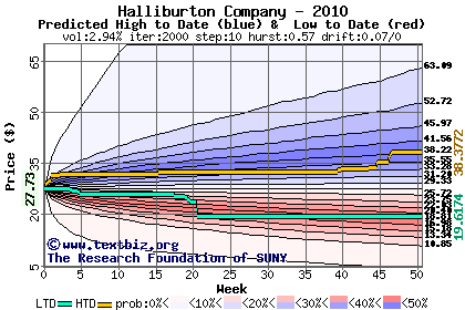 The high to date and low to date prices of the stock plotted against a random walk model for 2010 (what's this?).