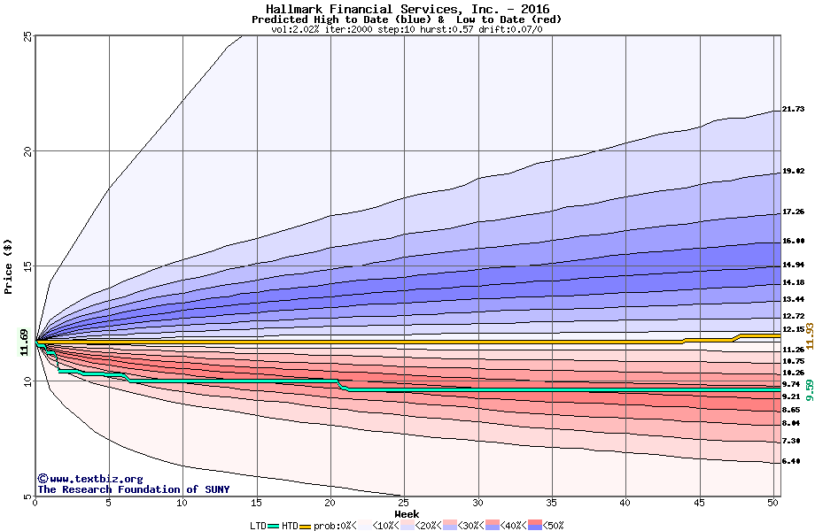 The high to date and low to date prices of the stock plotted against a random walk model for 2016 (what's this?).