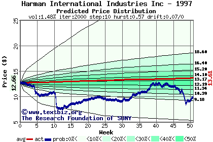 The high to date and low to date prices of the stock plotted against a random walk model for 1997 (what's this?).