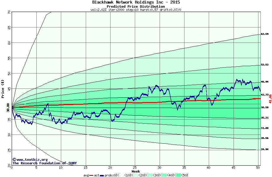 The following graph plots the year-to-date performance of the stock for 2015 compared to the probability calculated by a random walk model.