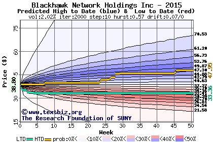 The high to date and low to date prices of the stock plotted against a random walk model for 2015 (what's this?).