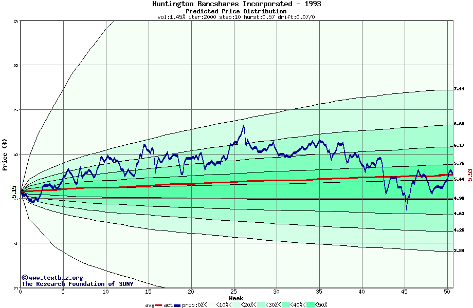 The following graph plots the year-to-date performance of the stock for 1993 compared to the probability calculated by a random walk model.