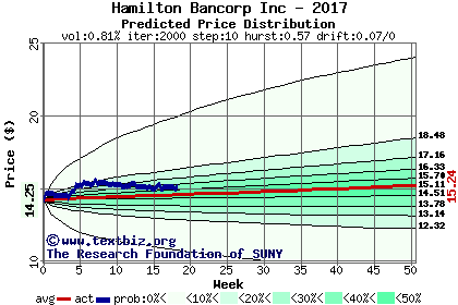 The high to date and low to date prices of the stock plotted against a random walk model for 2017 (what's this?).