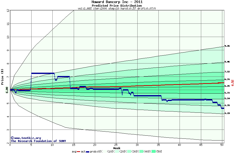 The high to date and low to date prices of the stock plotted against a random walk model for 2011 (what's this?).