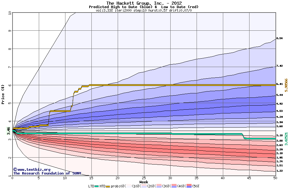 The following graph plots the year-to-date performance of the stock for 2012 compared to the probability calculated by a random walk model.