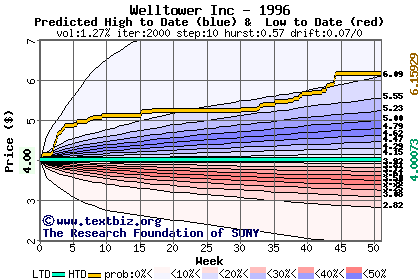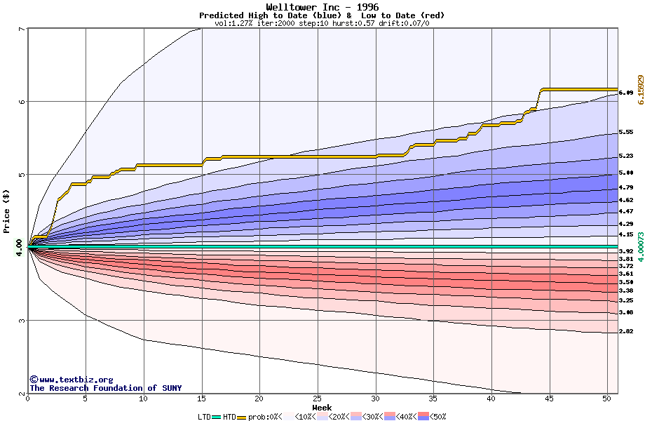 The high to date and low to date prices of the stock plotted against a random walk model for 1996 (what's this?).