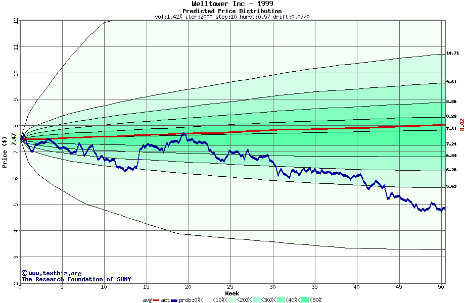The following graph plots the year-to-date performance of the stock for 1999 compared to the probability calculated by a random walk model.
