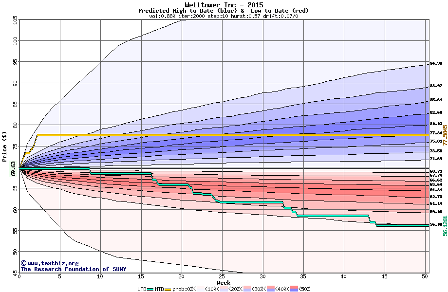 The high to date and low to date prices of the stock plotted against a random walk model for 2015 (what's this?).