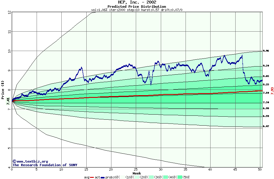 The following graph plots the year-to-date performance of the stock for 2002 compared to the probability calculated by a random walk model.