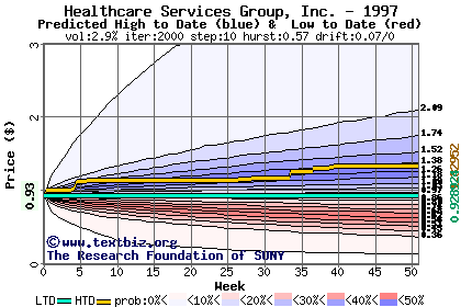 The high to date and low to date prices of the stock plotted against a random walk model for 1997 (what's this?).