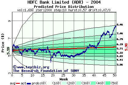 The high to date and low to date prices of the stock plotted against a random walk model for 2004 (what's this?).