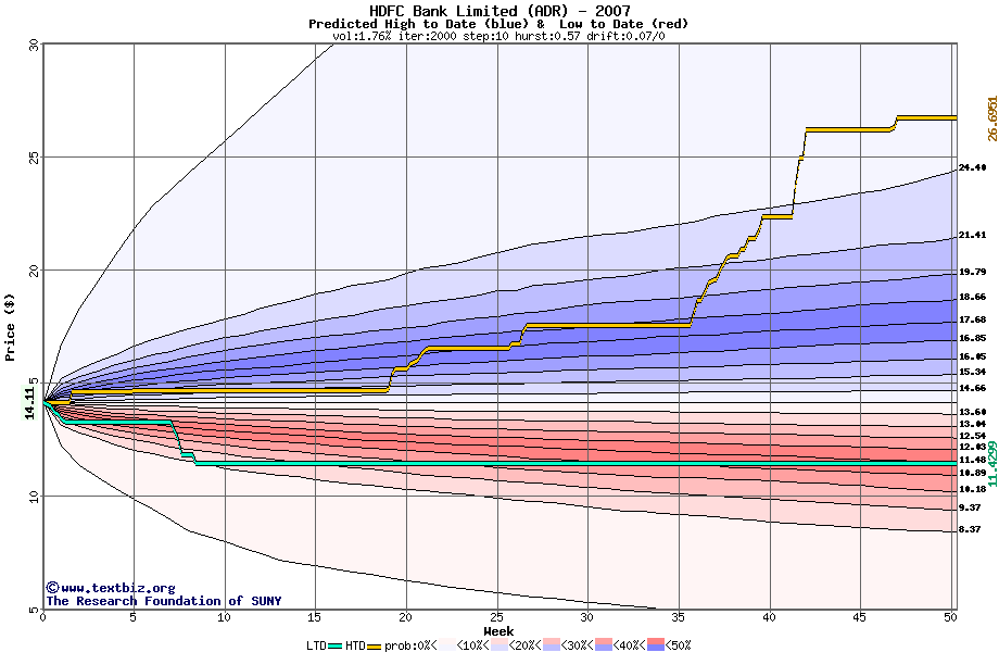 The high to date and low to date prices of the stock plotted against a random walk model for 2007 (what's this?).