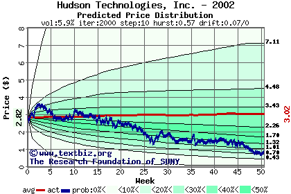 The high to date and low to date prices of the stock plotted against a random walk model for 2002 (what's this?).