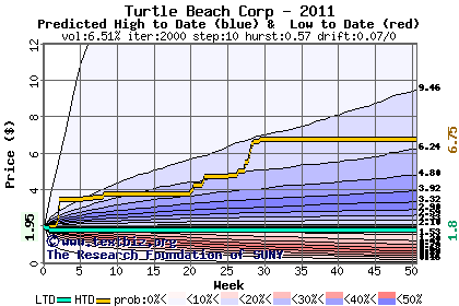 The high to date and low to date prices of the stock plotted against a random walk model for 2011 (what's this?).