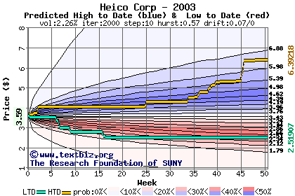 The high to date and low to date prices of the stock plotted against a random walk model for 2003 (what's this?).