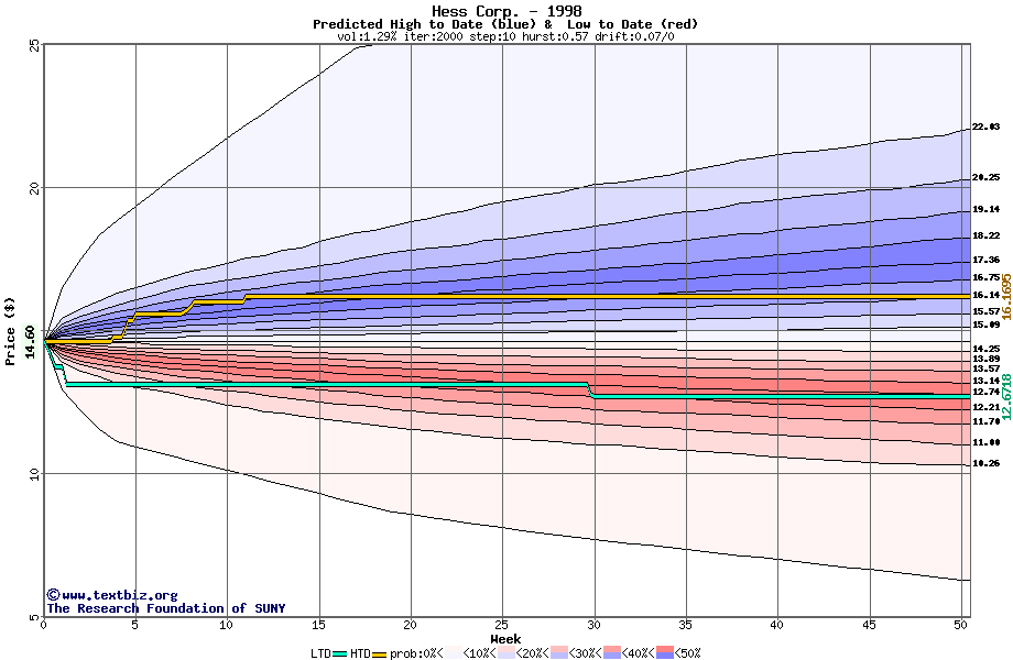 The high to date and low to date prices of the stock plotted against a random walk model for 1998 (what's this?).