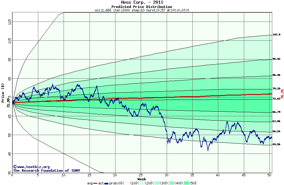 The following graph plots the year-to-date performance of the stock for 2011 compared to the probability calculated by a random walk model.