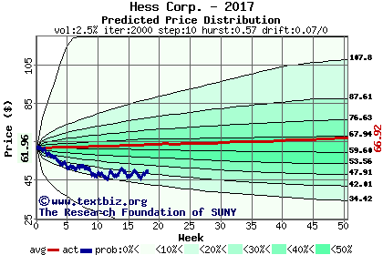 The high to date and low to date prices of the stock plotted against a random walk model for 2017 (what's this?).