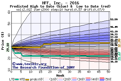 The high to date and low to date prices of the stock plotted against a random walk model for 2016 (what's this?).