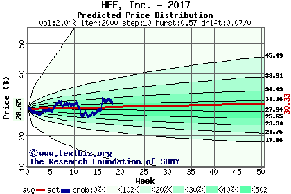 The high to date and low to date prices of the stock plotted against a random walk model for 2017 (what's this?).