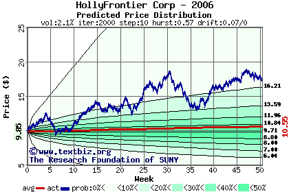 The high to date and low to date prices of the stock plotted against a random walk model for 2006 (what's this?).