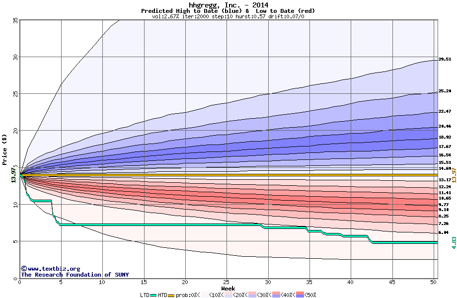 The high to date and low to date prices of the stock plotted against a random walk model for 2014 (what's this?).