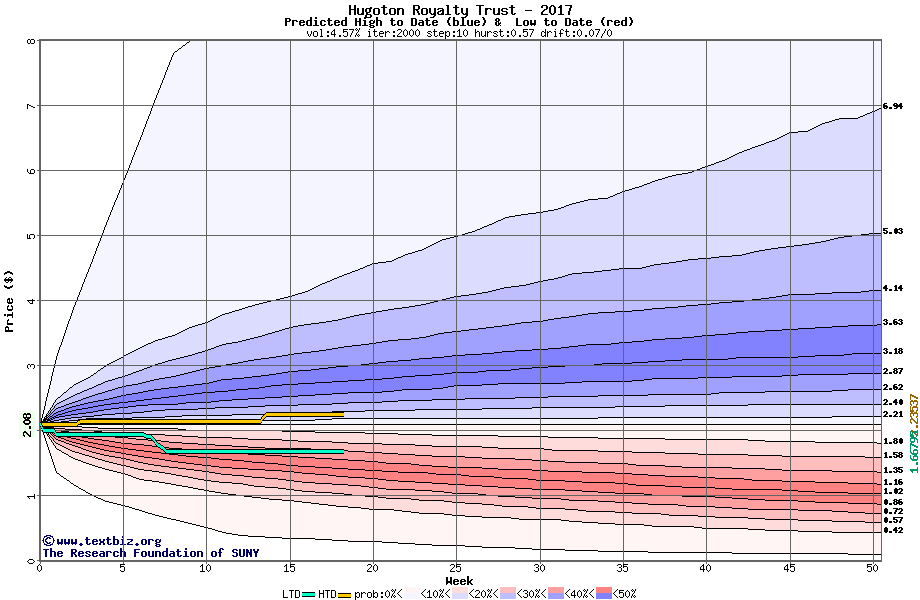 The high to date and low to date prices of the stock plotted against a random walk model for 2017 (what's this?).