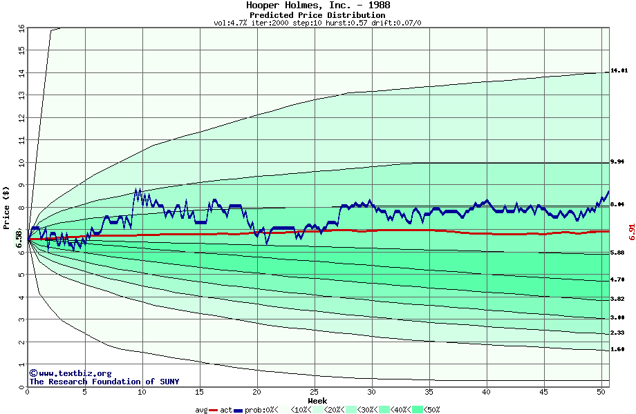 The following graph plots the year-to-date performance of the stock for 1988 compared to the probability calculated by a random walk model.
