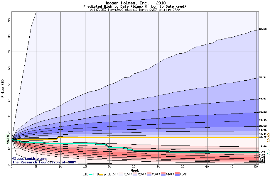 The high to date and low to date prices of the stock plotted against a random walk model for 2010 (what's this?).