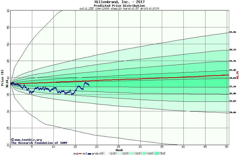 The high to date and low to date prices of the stock plotted against a random walk model for 2017 (what's this?).