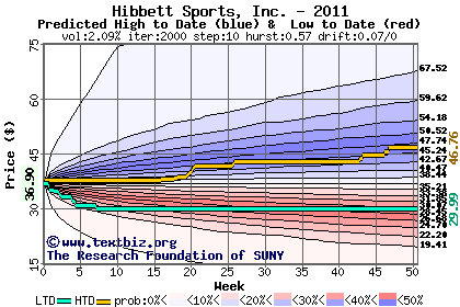 The high to date and low to date prices of the stock plotted against a random walk model for 2011 (what's this?).
