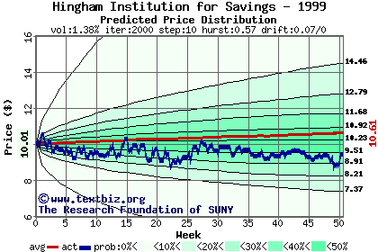 The high to date and low to date prices of the stock plotted against a random walk model for 1999 (what's this?).