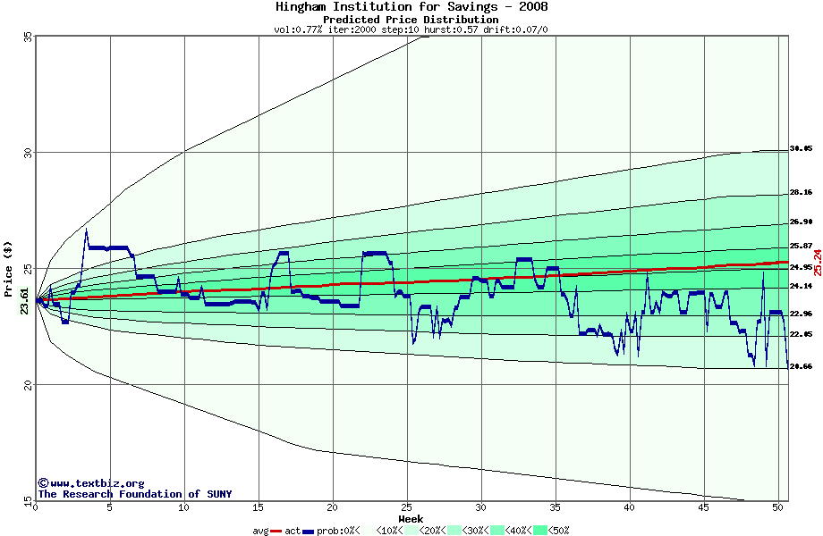 The following graph plots the year-to-date performance of the stock for 2008 compared to the probability calculated by a random walk model.