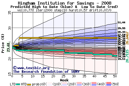 The high to date and low to date prices of the stock plotted against a random walk model for 2008 (what's this?).