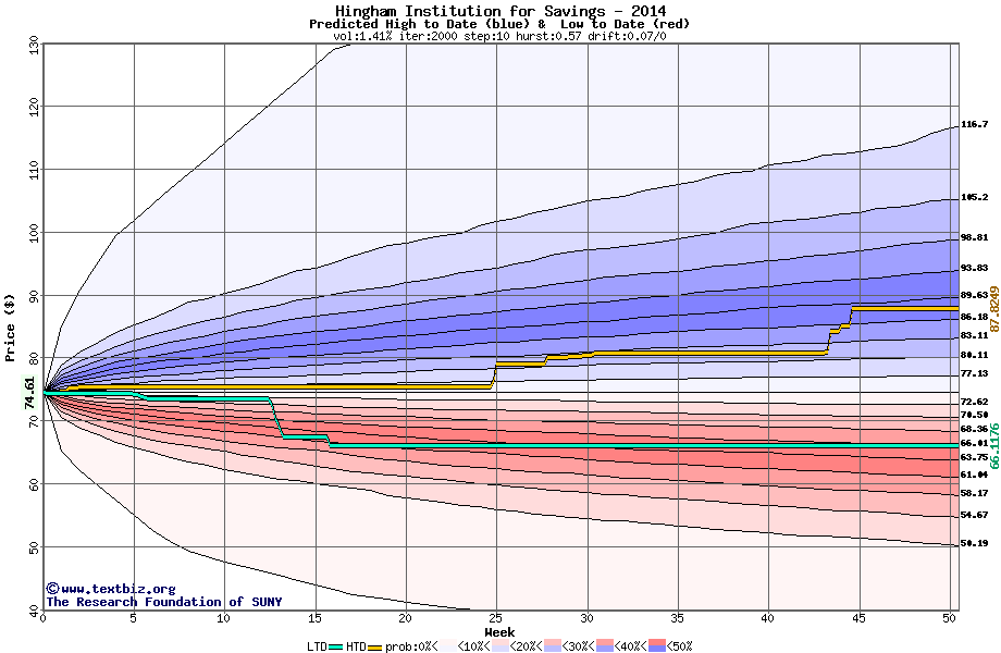 The high to date and low to date prices of the stock plotted against a random walk model for 2014 (what's this?).