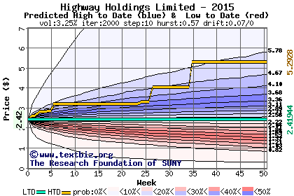 The high to date and low to date prices of the stock plotted against a random walk model for 2015 (what's this?).