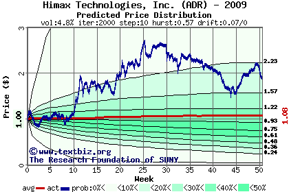 The high to date and low to date prices of the stock plotted against a random walk model for 2009 (what's this?).