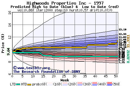 The high to date and low to date prices of the stock plotted against a random walk model for 1997 (what's this?).