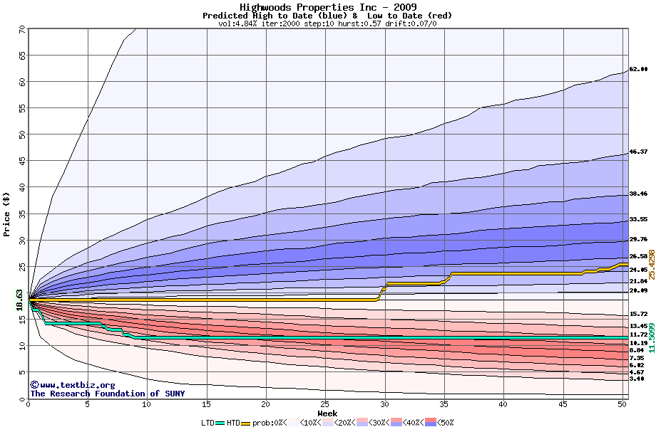 The high to date and low to date prices of the stock plotted against a random walk model for 2009 (what's this?).