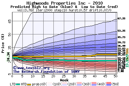 The high to date and low to date prices of the stock plotted against a random walk model for 2010 (what's this?).