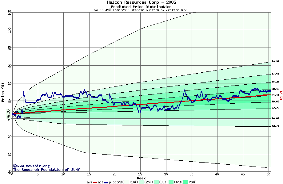 The following graph plots the year-to-date performance of the stock for 2005 compared to the probability calculated by a random walk model.