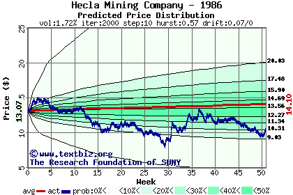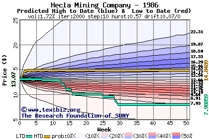 The high to date and low to date prices of the stock plotted against a random walk model for 1986 (what's this?).