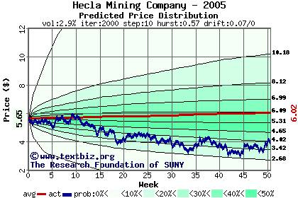 The high to date and low to date prices of the stock plotted against a random walk model for 2005 (what's this?).