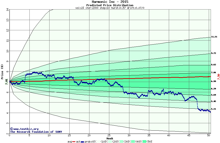 The following graph plots the year-to-date performance of the stock for 2015 compared to the probability calculated by a random walk model.