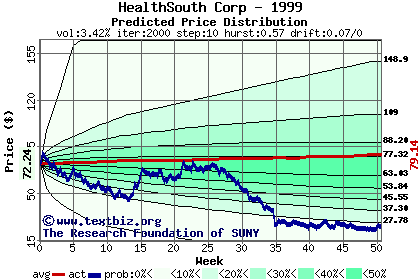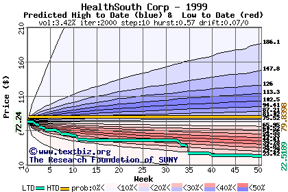 The high to date and low to date prices of the stock plotted against a random walk model for 1999 (what's this?).