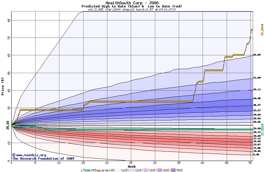 The high to date and low to date prices of the stock plotted against a random walk model for 2000 (what's this?).