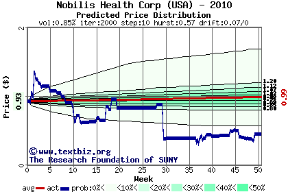 The high to date and low to date prices of the stock plotted against a random walk model for 2010 (what's this?).